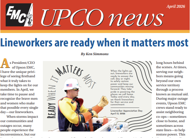 Upson EMC has a bi-monthly newsletter for its members so that you can stay up to date with what’s happening within the cooperative. The newsletter contains helpful information, tips, and forms that you can fill out to get the most out of your member experience.